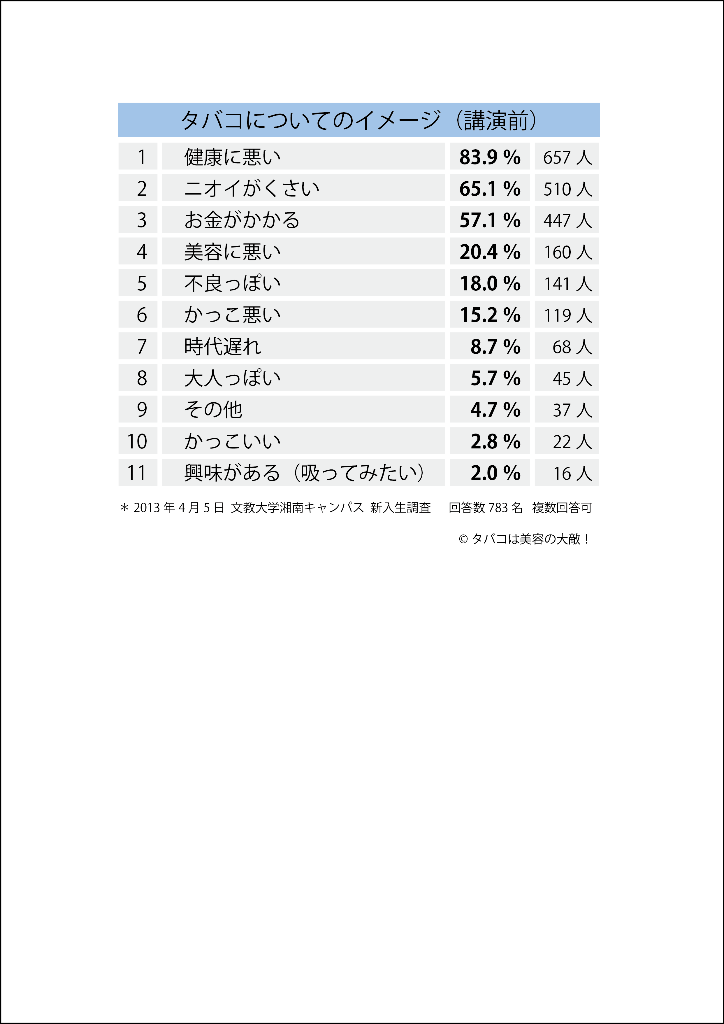 文教大学湘南キャンパス新入生に講演前に行った、タバコのイメージについてのアンケート結果です。(2013年4月5日 実施)