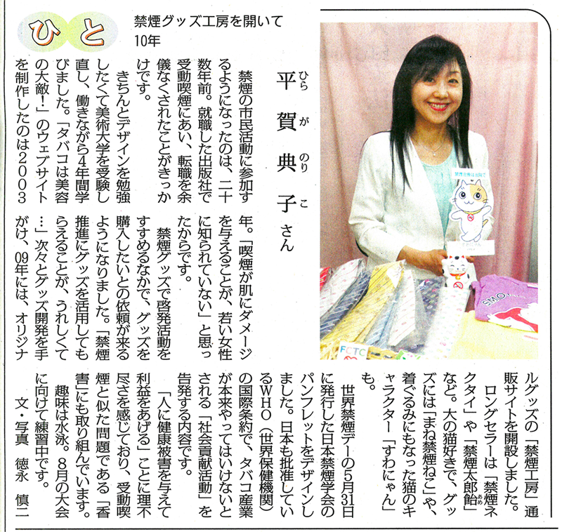 「ひと」欄に、これまでの禁煙活動についての取り組みが掲載になりました。運営者が取り組む、もうひとつの禁煙活動である、禁煙オリジナルグッズ「禁煙工房」を開設して10年になることなどを、取材いただきました。