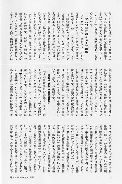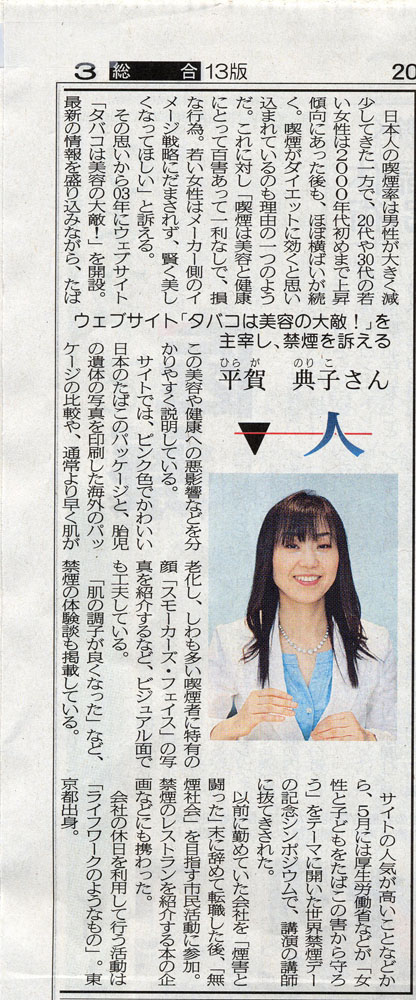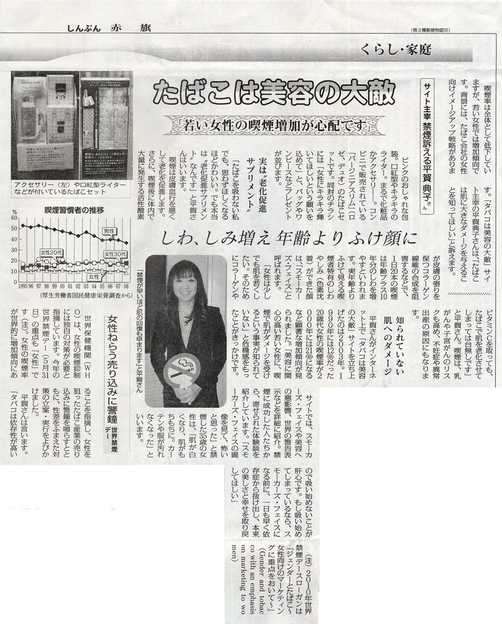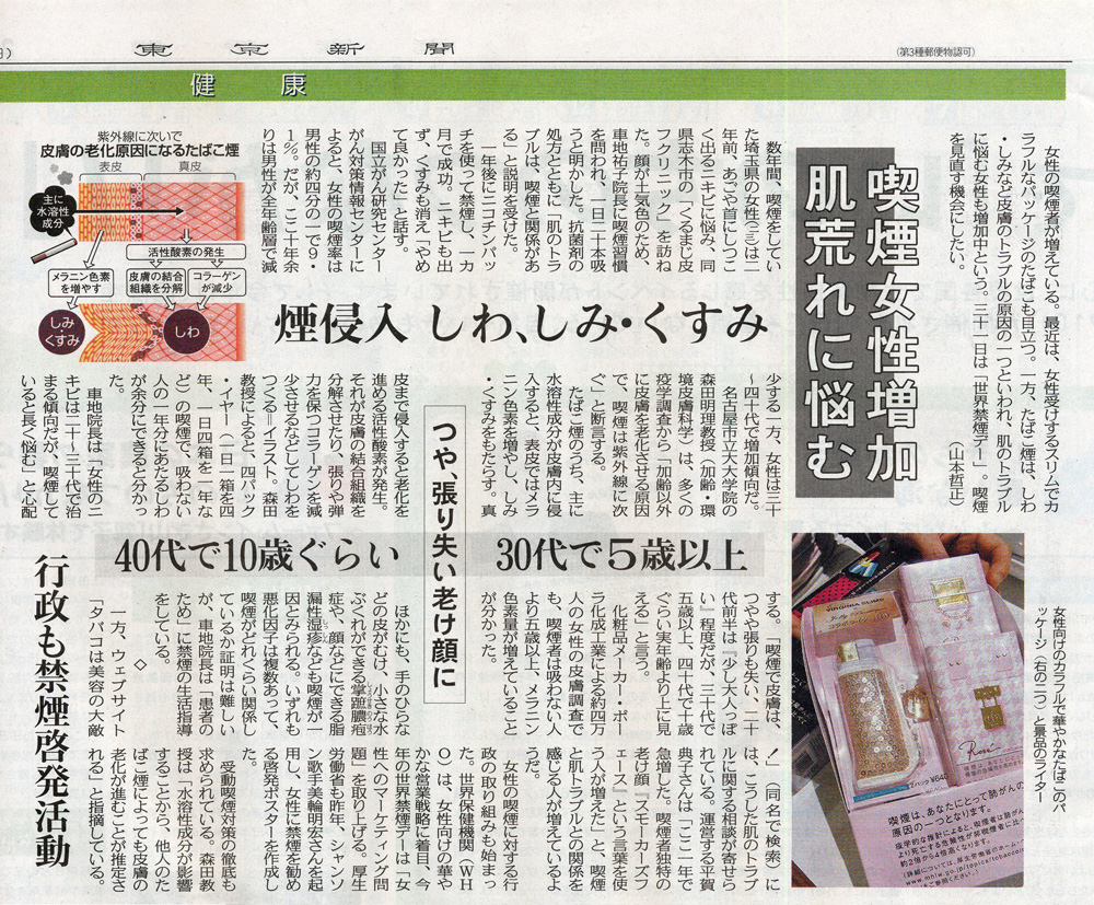 世界禁煙デーを前に、喫煙と肌のトラブルについての特集が掲載されました。インタビューと「タバコは美容の大敵!」の紹介記事、また、資料提供させていただいた女性向けタバコパッケージがカラーで掲載されました。