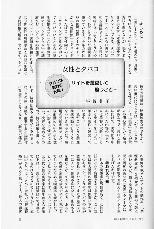 水戸市県立健康プラザで開催された「2010年度禁煙啓発研修会」にて、「女性」をテーマに、たばこが女性の美容や健康に与える影響、妊婦や子どもに及ぼす影響などの講演が記事になりました。