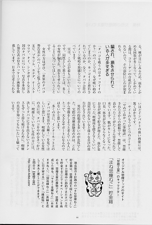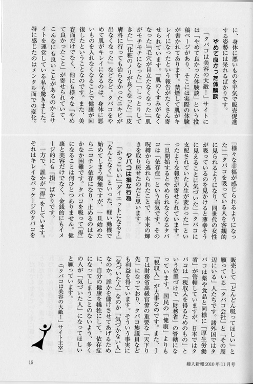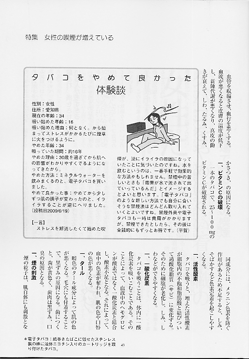 スモーカー女性にとって衝撃的なサイトとして紹介されました。芸能界デビューを目指す若い女性にとって、美しさは必須事項。若い女性の喫煙率が上がっている現状に、喫煙で美を損なうことがないよう、当サイトが紹介されたようです。芸能関係の一般雑誌に取り上げられたのは初めてでした。