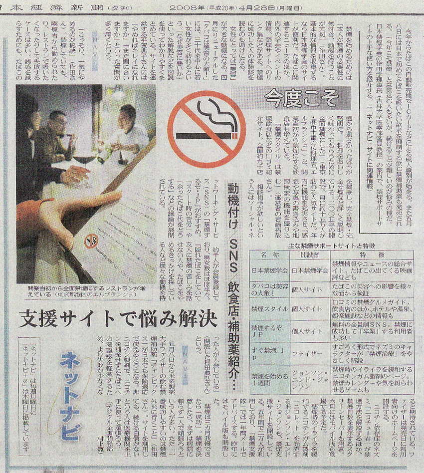 自動販売機のICカードによる成人識別や、飲む禁煙補助薬が発売されることにちなみ、「今年こそ禁煙」と考えている人をサポートするサイトとして、当サイト「タバコは美容の大敵!」が紹介されました。「日本禁煙学会」の作田理事長のコメントや、禁煙の飲食店を検索できる「禁煙スタイル」など、いろいろな切り口の禁煙サポートサイトが紹介されています。